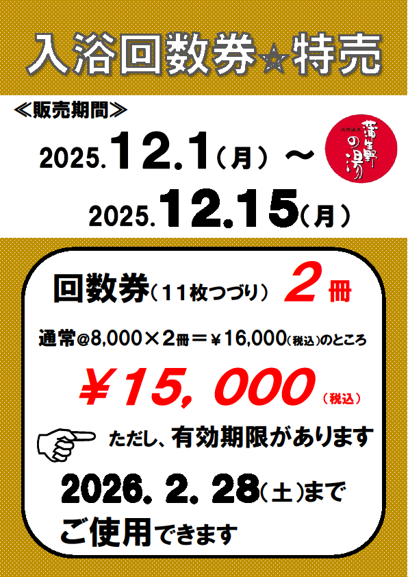 HOME >> お知らせ >> 入浴回数券☆特売!!2025/12/1~15まで